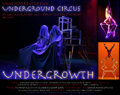 New pieces from the Underground Circus. Aerial and ground circus acts, and blends of circus, dance, and theatre. This show is geared to a family audience, suitable for children, but not designed for them.